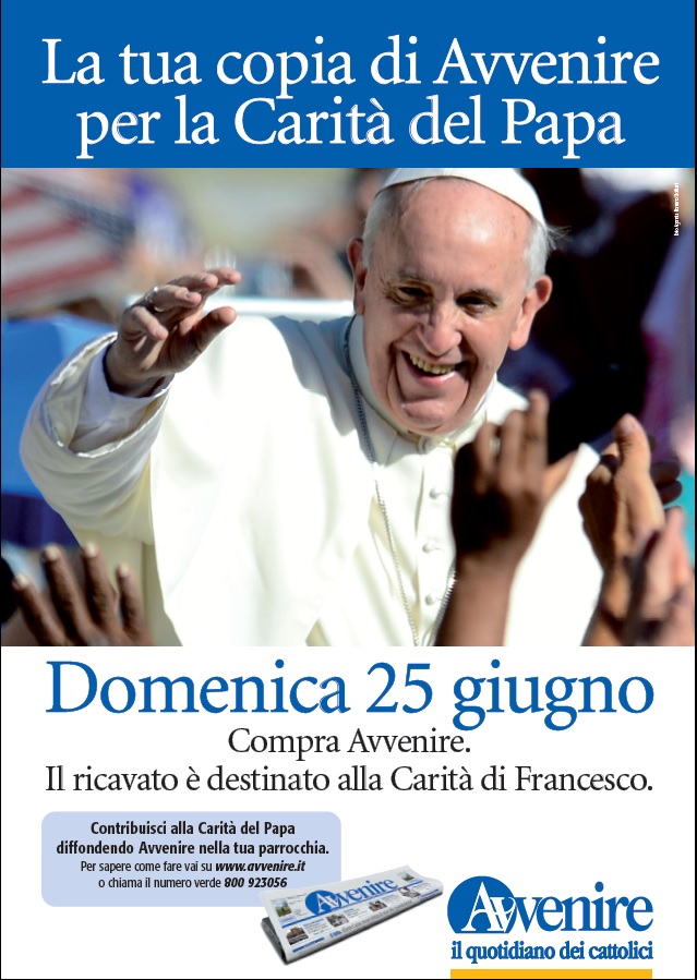 Anche quest’anno Avvenire si propone di dare un rinnovato sostegno alla Giornata per la Carità del Papa facendo del giornale stesso uno strumento a servizio della Sua carità. Il 25 giugno, infatti, tutto il ricavato delle copie vendute sarà devoluto all’Obolo di San Pietro.
